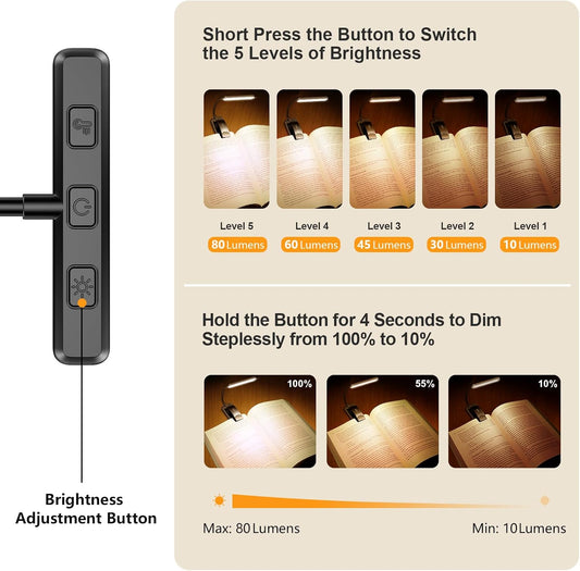 • 19 LED Rechargeable Book Light for Reading in Bed with Memory Function- Eye Caring 3 Color Temperatures,Stepless Dimming Brightness,80 Hrs Runtime Lightweight Clip on Light for Book Lovers