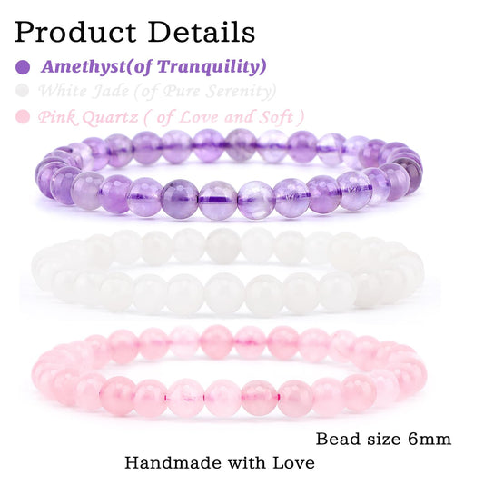 3-Piece 6Mm Natural Crystal Gemstone Stretch Bracelets – Amethyst, Pink Quartz, White Jade Handmade Reiki Energy Healing Jewelry for Meditation,Yoga, Unisex