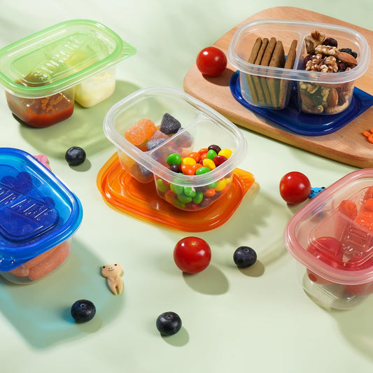 20Pcs Reusable Snack Containers with Lids,Double Compartment Snack Containers for Kids Adults, 10 Cute Forks,Bento Box-Lightweight and Stackable, Microwave, Refrigerator, Dishwasher Safe (4 Color)